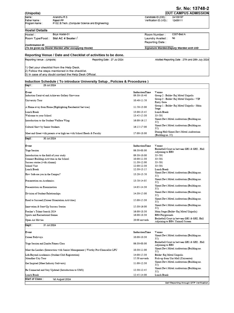 Reporting Venue : (Unipolis) Reporting Date : 27 Jul 2024 Allotted Reporting Date : 27th and 28th July 2024