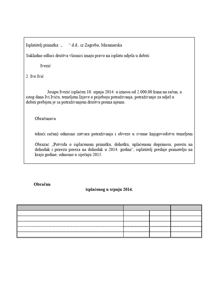 Primitak je Josipu Ivezić isplaćen 10. srpnja 2014. u iznosu od 2.000,00 kuna na raĉun, a