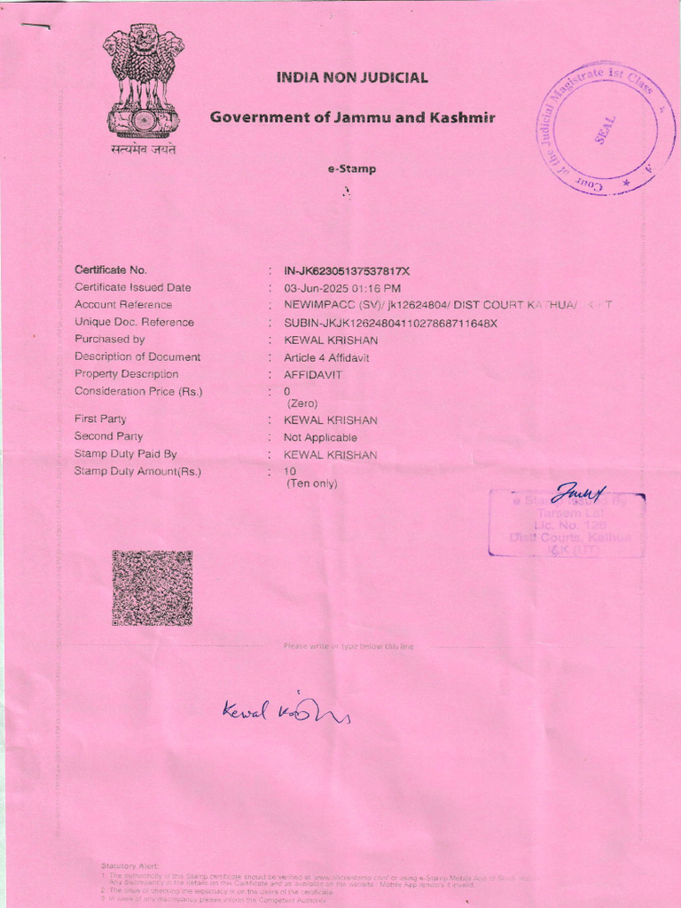 District Kathua, do hereby solemnly aFfirm and declare on oath as under :-