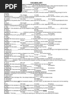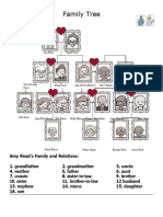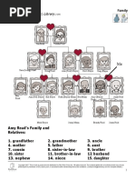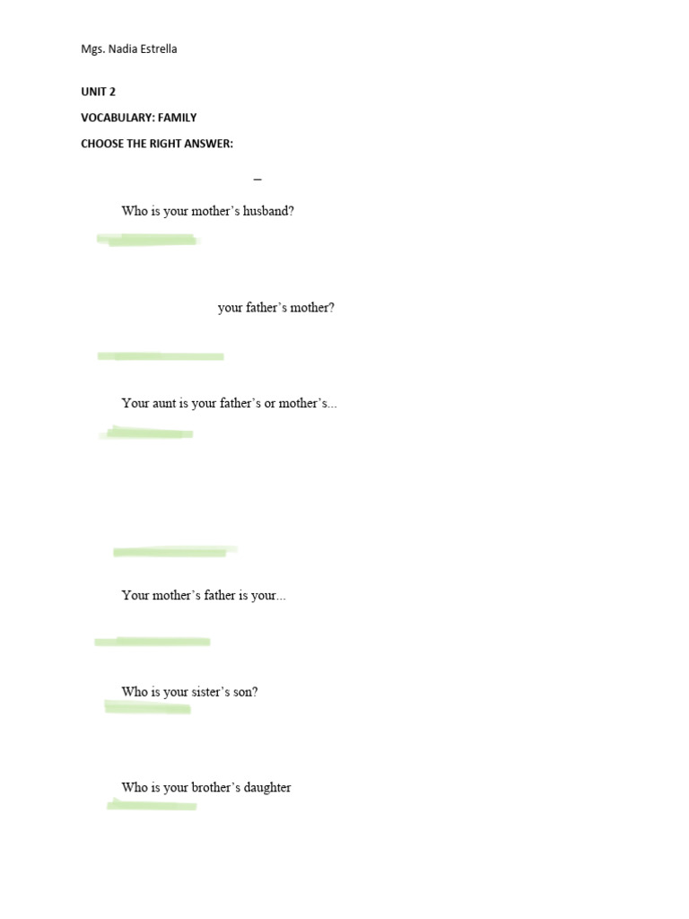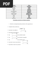 This document contains a series of multiple-choice exercises focused on family vocabulary. It includes questions about familial relationships, such as identifying the roles of mother, father, aunt, uncle, and cousin. The exercises aim to test understanding of family terms and their connections.