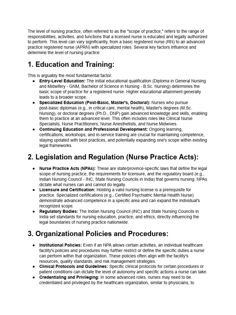 The level of nursing practice, often referred to as the "scope of practice," refers to the range of