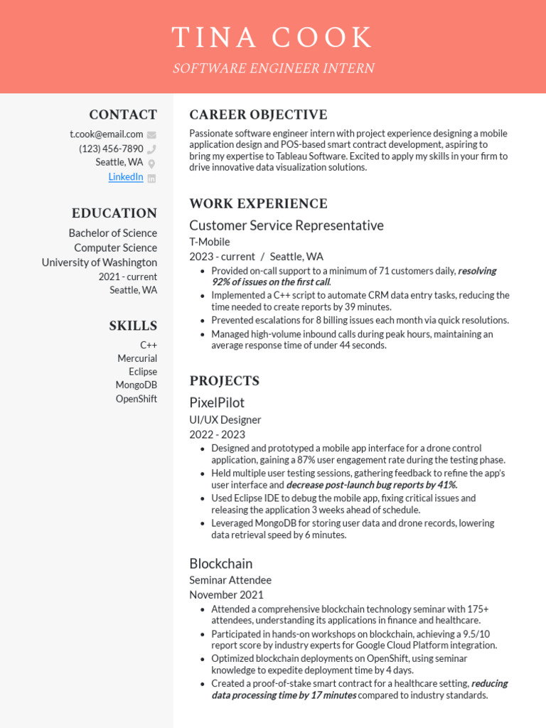 t.cook@email.com Passionate software engineer intern with project experience designing a mobile