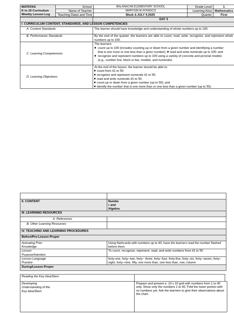 K to 10 Curriculum Name of Teacher MARYGIN M.AYANGCO Learning Area Mathematics