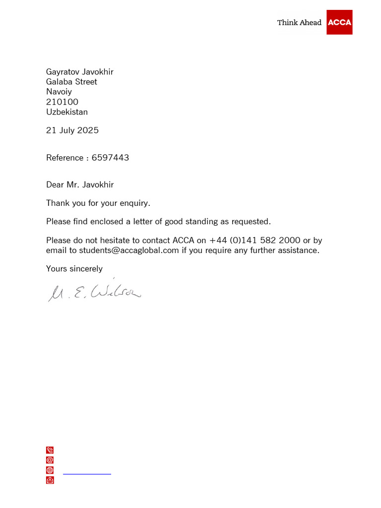 Please do not hesitate to contact ACCA on +44 (0)141 582 2000 or by