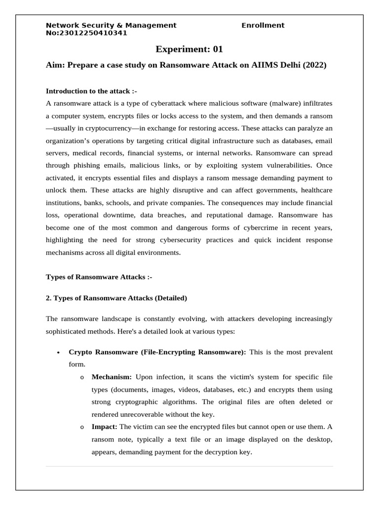 Aim: Prepare a case study on Ransomware Attack on AIIMS Delhi (2022)