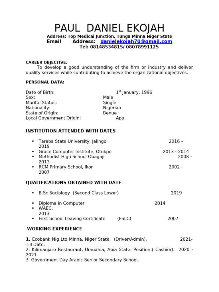 1. Ecobank Nig Ltd Minna, Niger State. (Driver/Admin). 2021-
