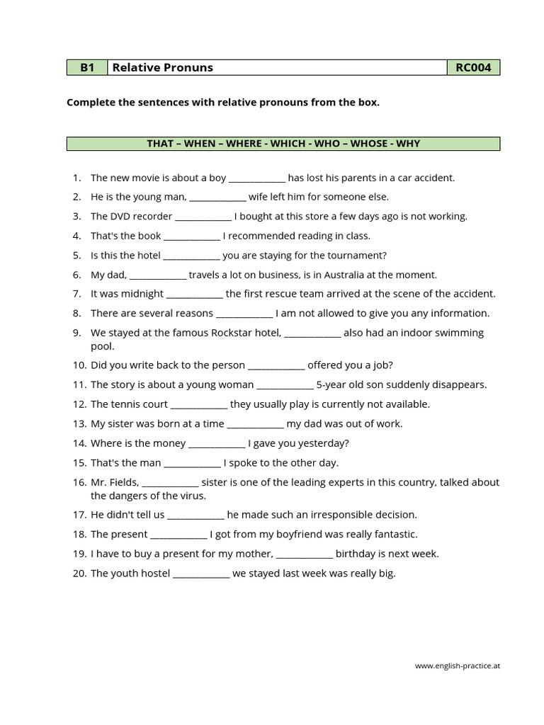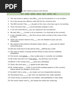 This document is an exercise focused on completing sentences with appropriate relative pronouns such as 'that', 'who', 'which', and others. It contains 20 sentences that require the insertion of these pronouns to create grammatically correct statements. The exercise is designed to enhance understanding and usage of relative pronouns in English.