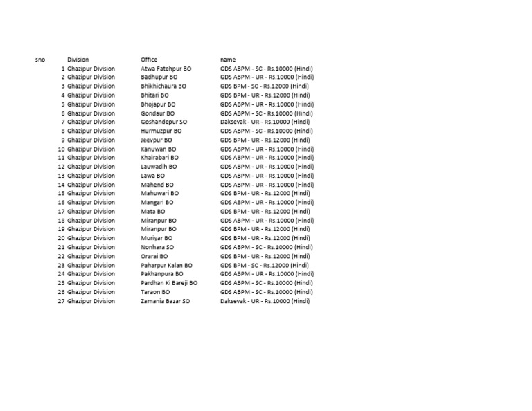 1 Ghazipur Division Atwa Fatehpur BO GDS ABPM - SC - Rs.10000 (Hindi)