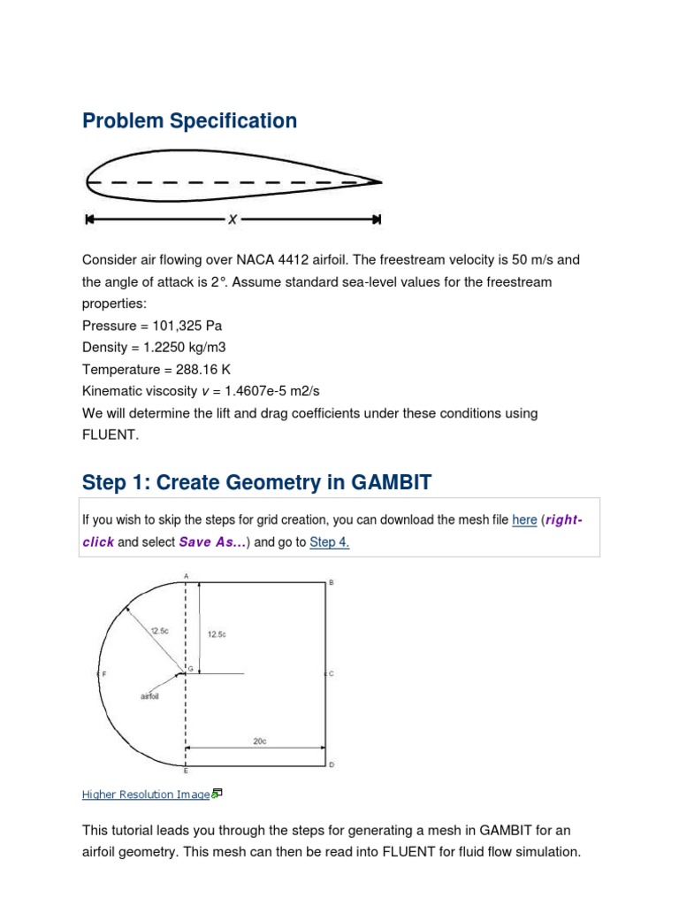 Consider air flowing over NACA 4412 airfoil. The freestream velocity is 50 m/s and the angle of attack is 2. Assume standard sea-level values for the freestream properties: Pressure = 101,325 Pa Density = 1.2250 kg/m3 Temperature = 288.16 K Kinematic viscosity v = 1.4607e-5 m2/s We will determine the lift and drag coefficients under these conditions using FLUENT.