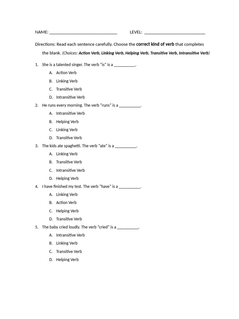 the blank. (Choices: Action Verb, Linking Verb, Helping Verb, Transitive Verb, Intransitive Verb)
