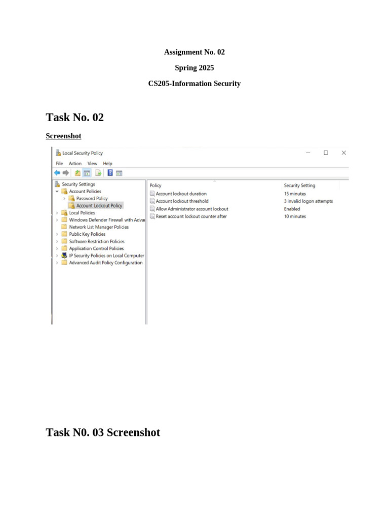 The document is an assignment for a course titled CS205-Information Security for Spring 2025. It includes references to Task No. 02 and Task No. 03, both of which require screenshots. The document appears to be a part of a larger assignment structure.
