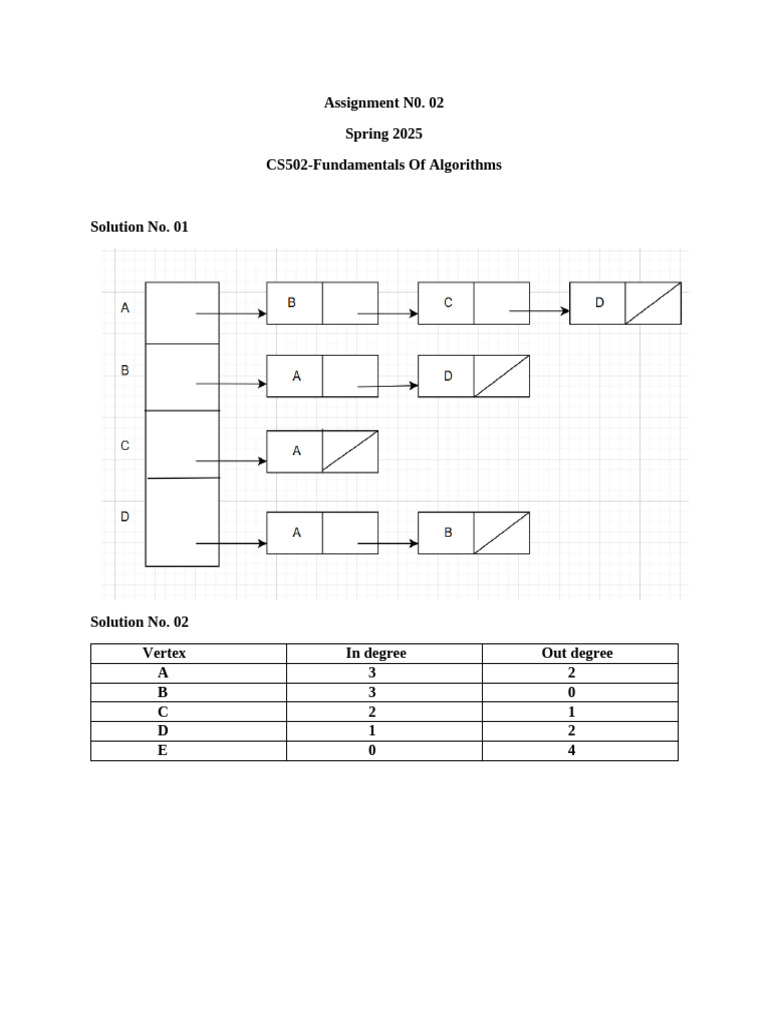 This document is an assignment for the course CS502-Fundamentals of Algorithms for Spring 2025. It includes a table detailing the in-degree and out-degree of various vertices labeled A through E. The data indicates the connections and flow between these vertices in a graph structure.