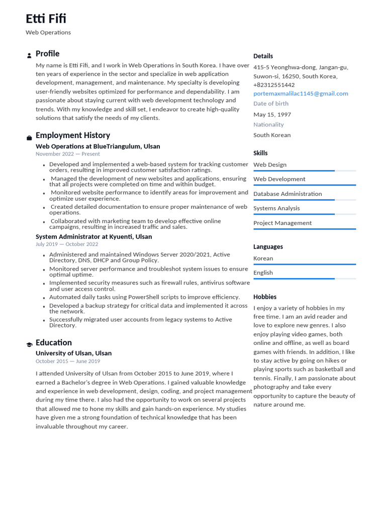 My name is Etti Fifi, and I work in Web Operations in South Korea. I have over 415-5 Yeonghwa-dong, Jangan-gu,