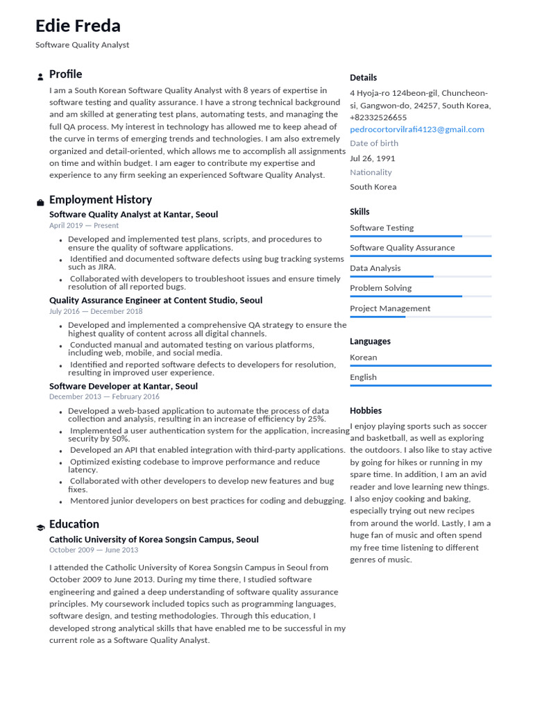 I am a South Korean Software Quality Analyst with 8 years of expertise in 4 Hyoja-ro 124beon-gil, Chuncheon-