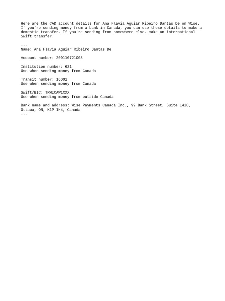 Here are the CAD account details for Ana Flavia Aguiar Ribeiro Dantas De on Wise.