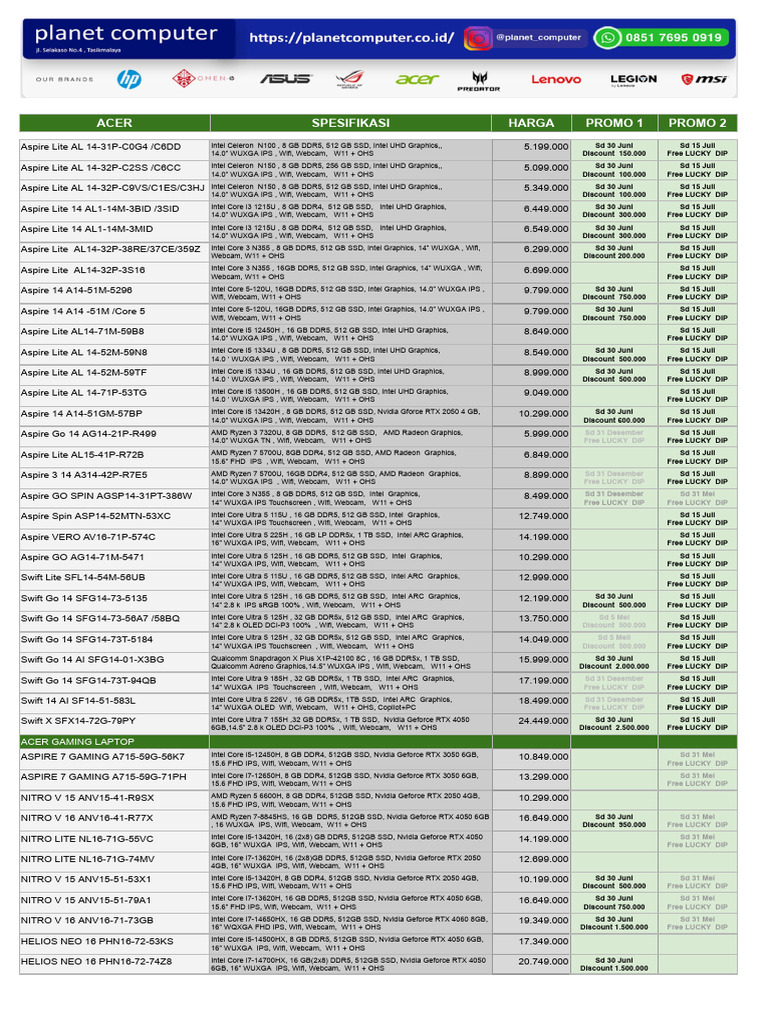 Aspire Lite AL14-32P-38RE/37CE/359Z Intel Core 3 N355 , 8 GB DDR5, 512 GB SSD, Intel Graphics, 14” WUXGA , Wifi, 6.299.000 Sd 30 Juni Sd 15 Juli