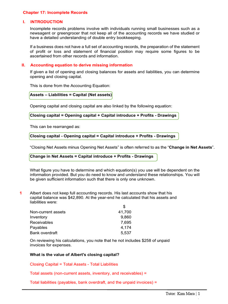 1 Albert does not keep full accounting records. His last accounts show that his