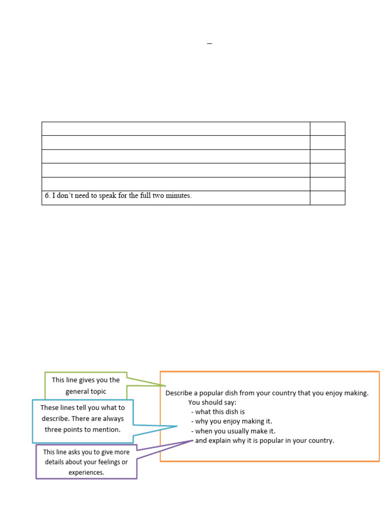 In Part 2 of the Speaking exam, the examiner will ask you to speak for one or two minutes on the