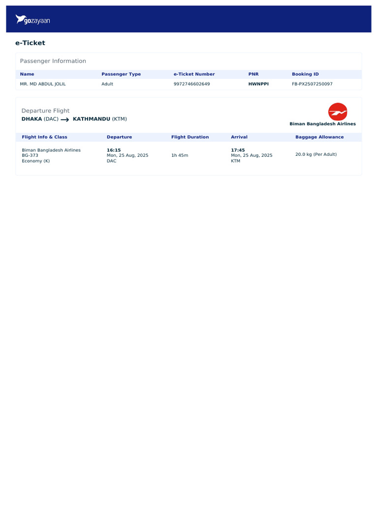 BG-373 Mon, 25 Aug, 2025 1h 45m Mon, 25 Aug, 2025 20.0 kg (Per Adult)