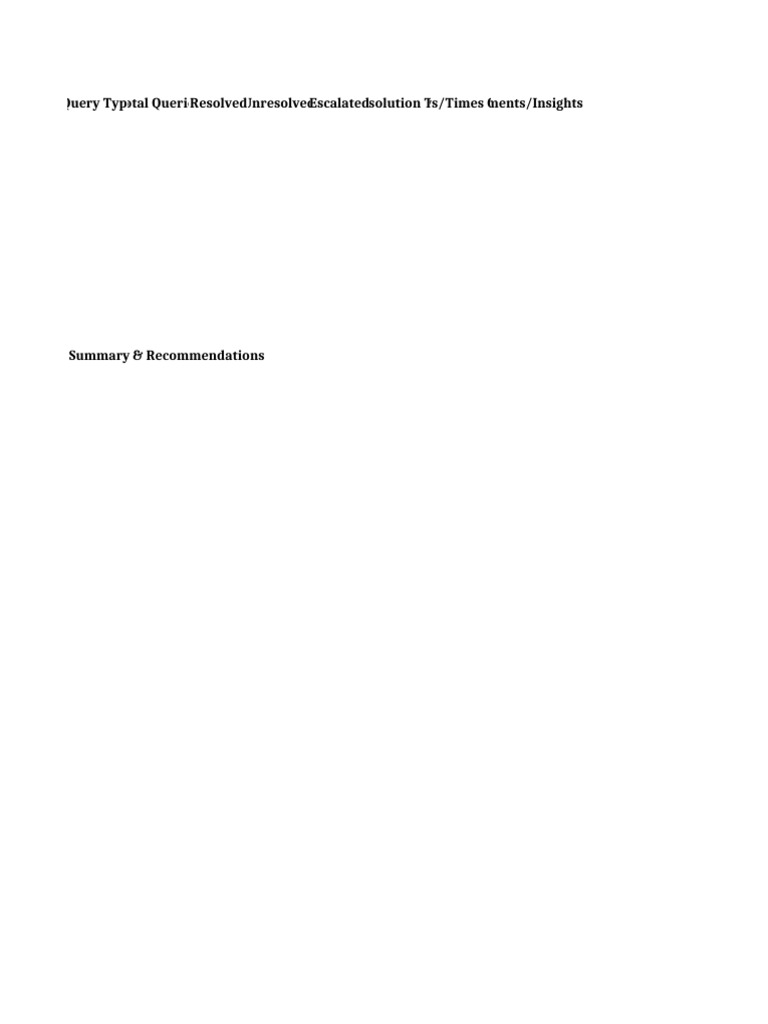 The document outlines various metrics related to query types, including total queries, resolution status, and average resolution times. It also highlights peak days and times for queries, along with comments and insights. Recommendations for improving query resolution processes may be included.