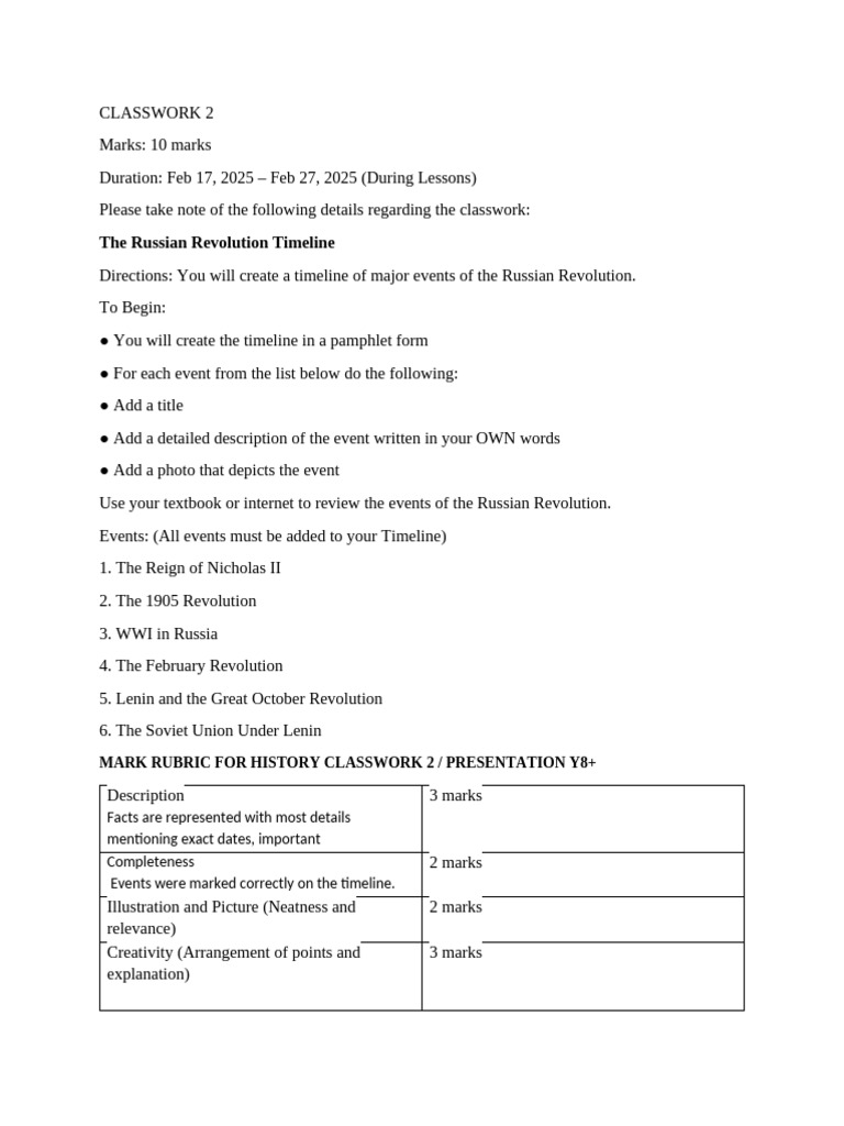 MARK RUBRIC FOR HISTORY CLASSWORK 2 / PRESENTATION Y8+