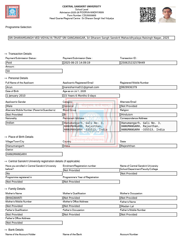 SRI DHARAMSANGH VED VIDYALYA TRUST SRI GANGANAGAR, Sri Dharam Sangh Sanskrit Mahavidhyalaya Raisingh Nagar, 2025