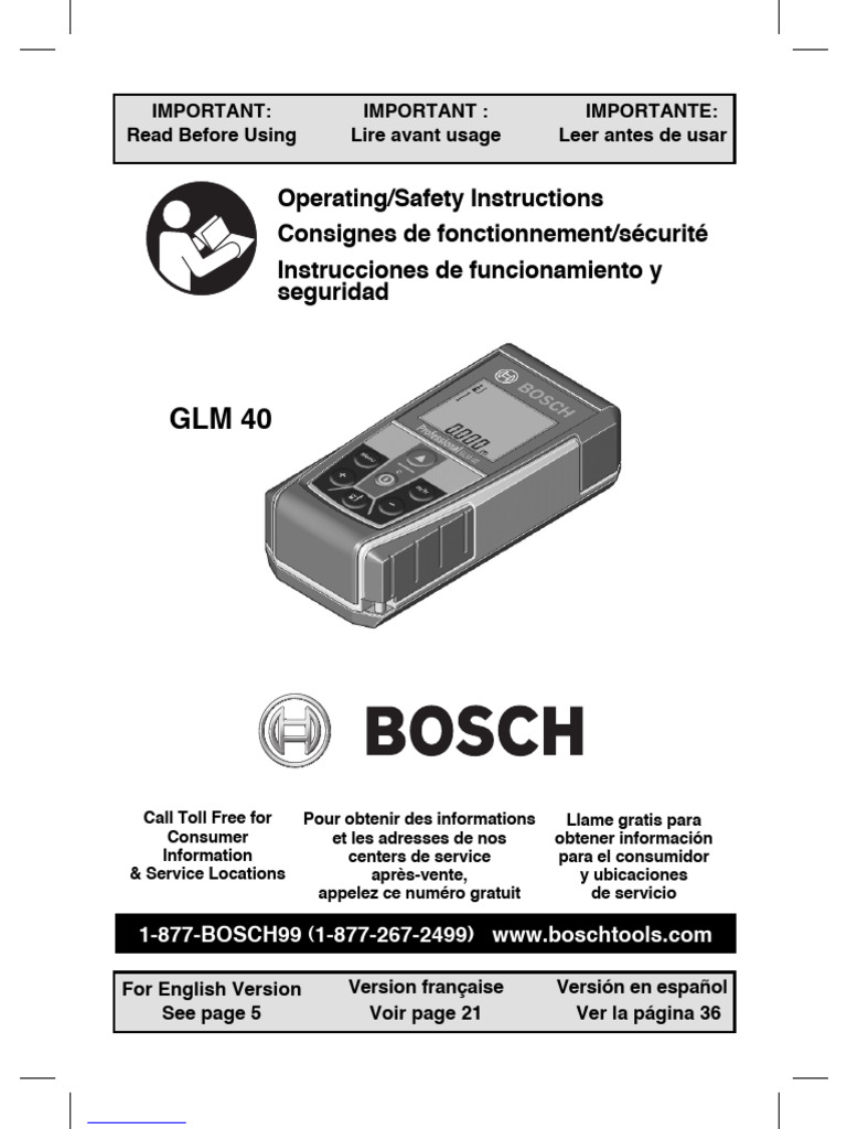 1-877-BOSCH99 (1-877-267-2499) www.boschtools.com