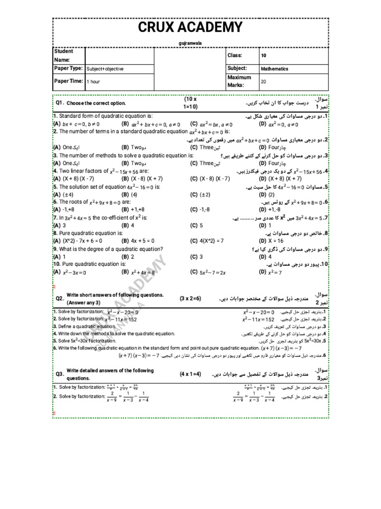 10. Pure quadratic equation is: ـ پیور دو درجی مساوات ہے۔10
