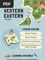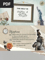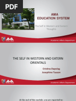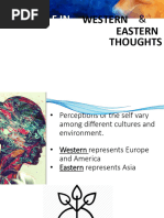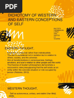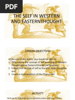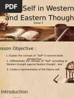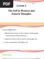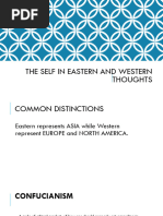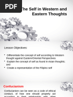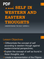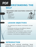 The document explores the concept of self from both Western and Eastern perspectives, highlighting key differences in their understanding. Eastern thoughts, including Confucianism, Taoism, and Buddhism, emphasize interconnectedness, selflessness, and the illusion of self, while Western thoughts focus on individualism and personal achievement. The document also discusses how these cultural perspectives influence social behavior and self-perception, particularly in the context of Filipino identity shaped by both Asian and Western influences.