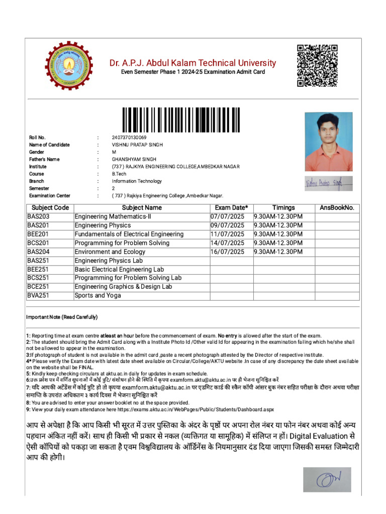 6:उक्त प्रवेश पत्र में वर्णित सूचनाओं में कोई त्रुटि/ संशोधन होने की स्थिति में कृ पया examform.aktu@aktu.ac.in पर ही भेजना सुनिश्चित करें