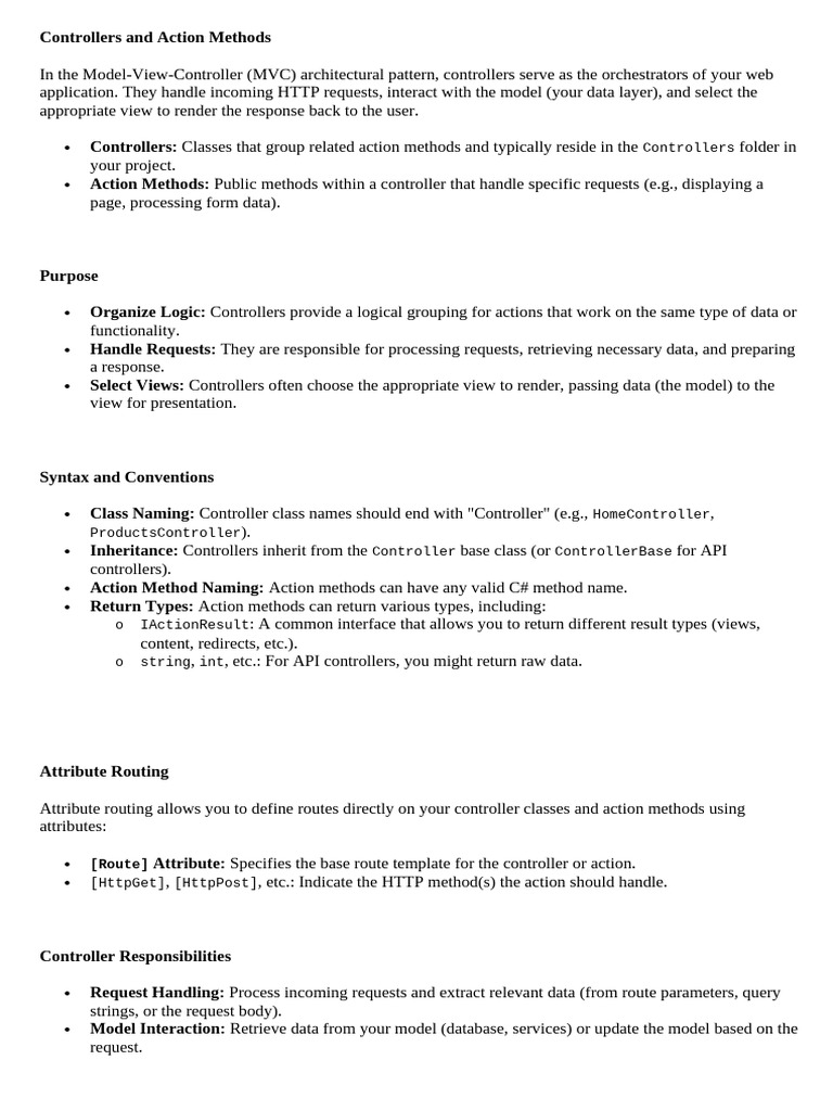 Action Methods: Public methods within a controller that handle specific requests (e.g., displaying a