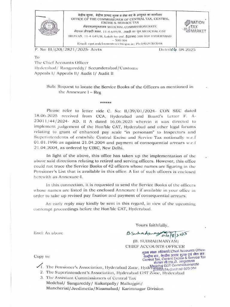 The document is a request from the Chief Accounts Office to locate the Service Books of 42 officers in order to implement a court judgment regarding enhanced pay scales for Inspectors and Superintendents of Central Excise and Service Tax. The request is made in light of upcoming contempt proceedings and includes a list of the officers whose Service Books are needed. An early response is requested to facilitate the revised pay fixation and payment of arrears.