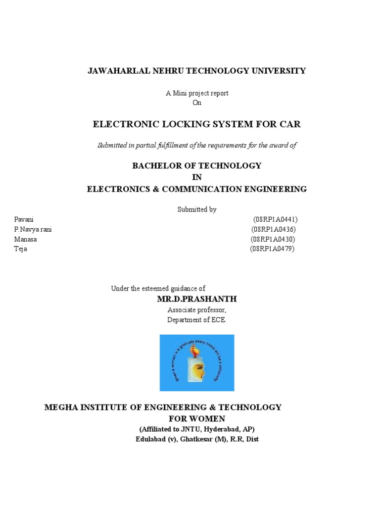 This is to certified that Mini project work entitled ELECTRONIC LOCKING SYSTEM FOR CAR Is a bonifide work carried out by Pavani (08RP1A0441), P.Navya rani (08RP1A0436), Manasa (08RP1A0479), Teja (08RP1A0479) , In partial fulfillment of the requirements for the degree BACHELOR OF TECHNOLOGY in ELECTRONICS & COMMUNICATION ENGINEERING by Jawaharlal Nehru technological university, Hyderabad ,during the academic year 2008-2012. The results embodies in this report have not been submitted to any other university or institution for the award of any degree.