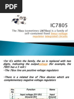 3.1.7: 7805 Regulator Description The 7805 voltage regulators employ built-in current limiting, thermal shutdown, and safe-operating area protection which makes them virtually immune to damage from output overloads. 7805 is a three-terminal positive voltage regulator. With adequate heat sinking, it can deliver in excess of 0.5A output current. Typical applications would include local (oncard) regulators which can eliminate the noise and degraded performance associated with single-point regulation. 7805 regulator comes from the 78xx family of self-contained fixed linear voltage regulator integrated circuits. The 78xx family is a very popular choice for many electronic circuits which require a regulated power supply, due to their ease of use and relative cheapness. When specifying individual ICs within this family, the xx is replaced with a two-digit number, which indicates the output voltage the particular device is designed to provide (for example, the 7805 voltage regulator has a 5 volt output, while the 7812 produces 12 volts). The 78xx line are positive voltage regulators, meaning that they are designed to produce a voltage that is positive relative to a common ground. There is a related line of 79xx devices which are complementary negative voltage regulators. 78xx and 79xx ICs can be used in combination to provide both positive and negative supply voltages in the same circuit, if necessary. 7805 ICs have three terminals and are most commonly found in the TO220 form factor, although smaller surface-mount and larger TO3 packages are also available from some manufacturers. These devices typically support an input voltage which can be anywhere from a couple of volts over the intended output voltage, up to a maximum of 35 or 40 volts, and can typically provide up to around 1 or 1.5 amps of current (though smaller or larger packages may have a lower or higher current rating). The 7805 series has several key advantages over many other voltage regulator circuits which have resulted in its popularity: