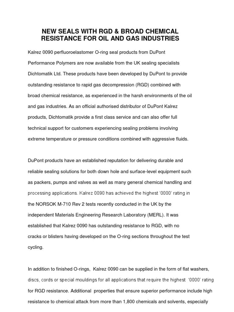DuPont products have an established reputation for delivering durable and reliable sealing solutions for both down hole and surface-level equipment such as packers, pumps and valves as well as many general chemical handling and processing applications. Kalrez 0090 has achieved the highest 0000 rating in the NORSOK M-710 Rev 2 tests recently conducted in the UK by the independent Materials Engineering Research Laboratory (MERL). It was established that Kalrez 0090 has outstanding resistance to RGD, with no cracks or blisters having developed on the O-ring sections throughout the test cycling.