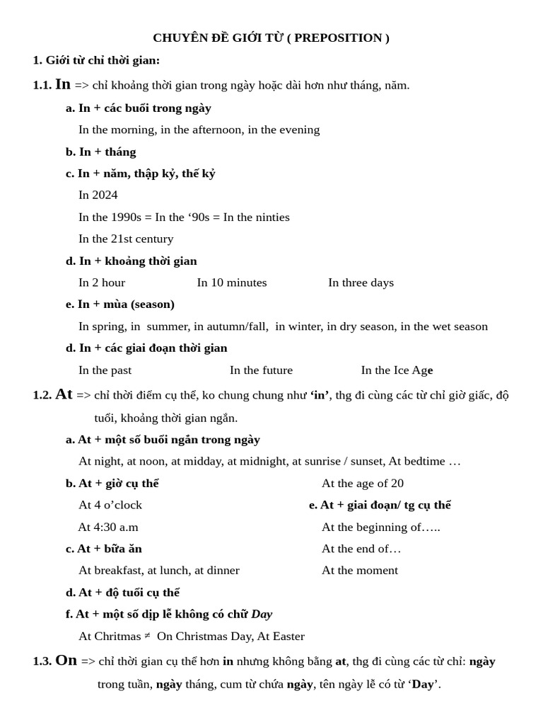 1.2. At => chỉ thời điểm cụ thể, ko chung chung như ‘in’, thg đi cùng các từ chỉ giờ giấc, độ