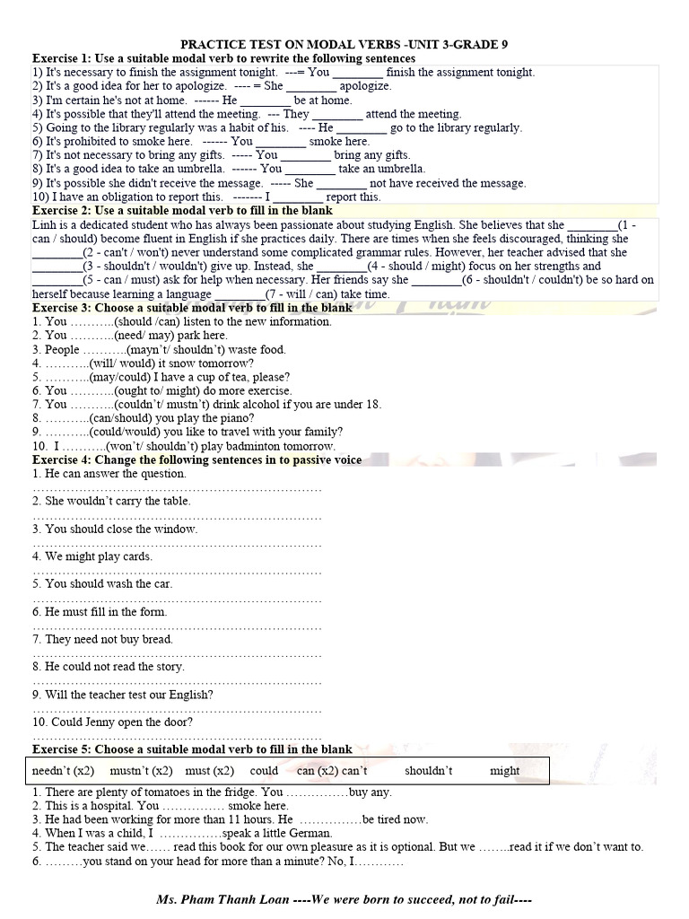 PRACTICE TEST ON MODAL VERBS -UNIT 3-GRADE 9