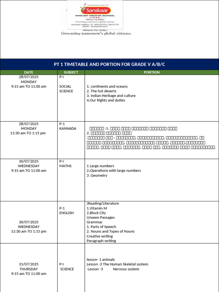 PT 1 TIMETABLE AND PORTION FOR GRADE V A/B/C