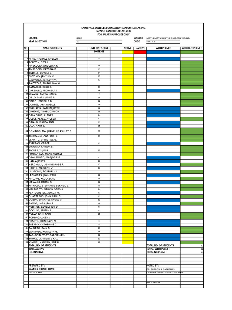 NO. NAME STUDENTS UNIT TEST SCORE ACTIVE INACTIVE WITH PERMIT WITHOUT PERMIT
