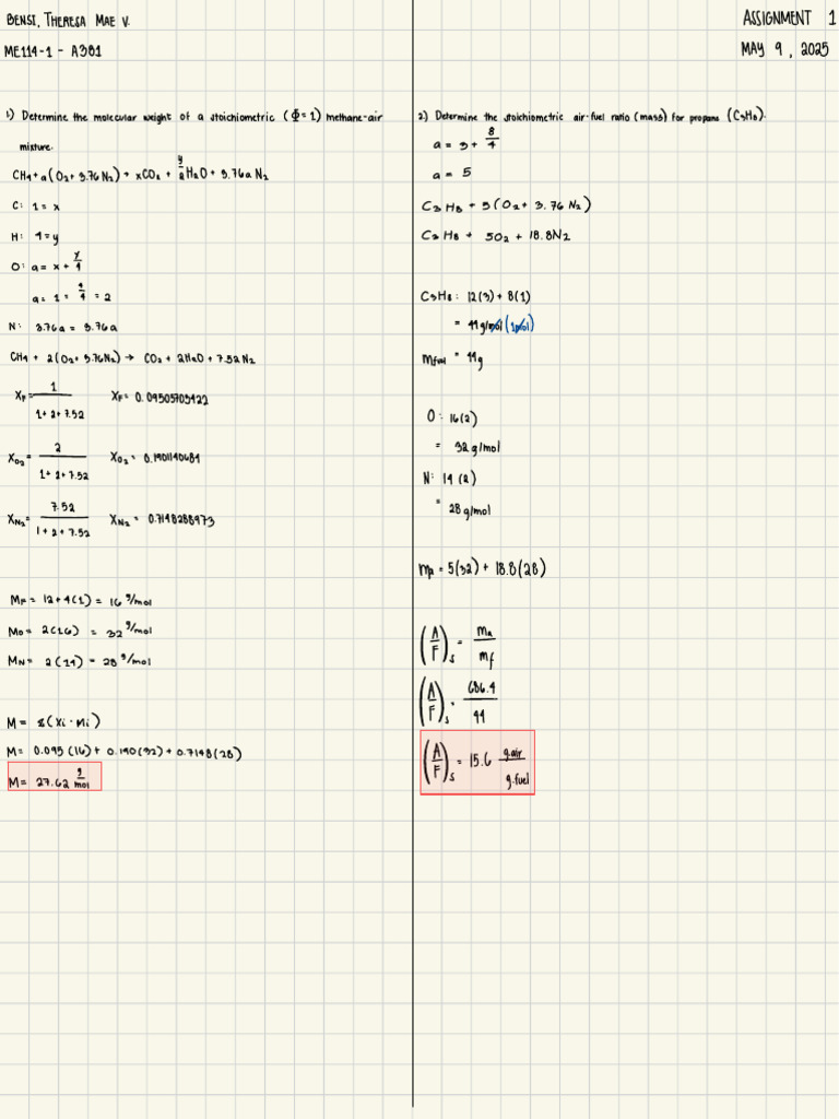 1) methane-air 2) Determine the stoichiometric air-fuel ratio (mass) for propane (C3H8).