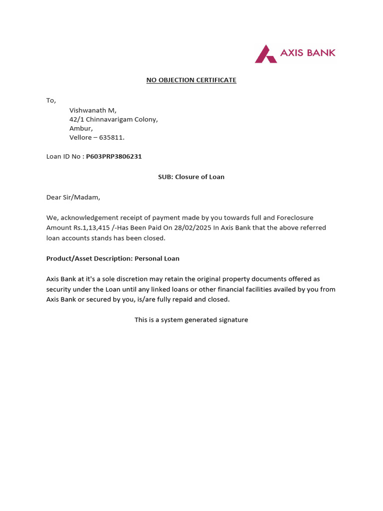 Axis Bank or secured by you, is/are fully repaid and closed.