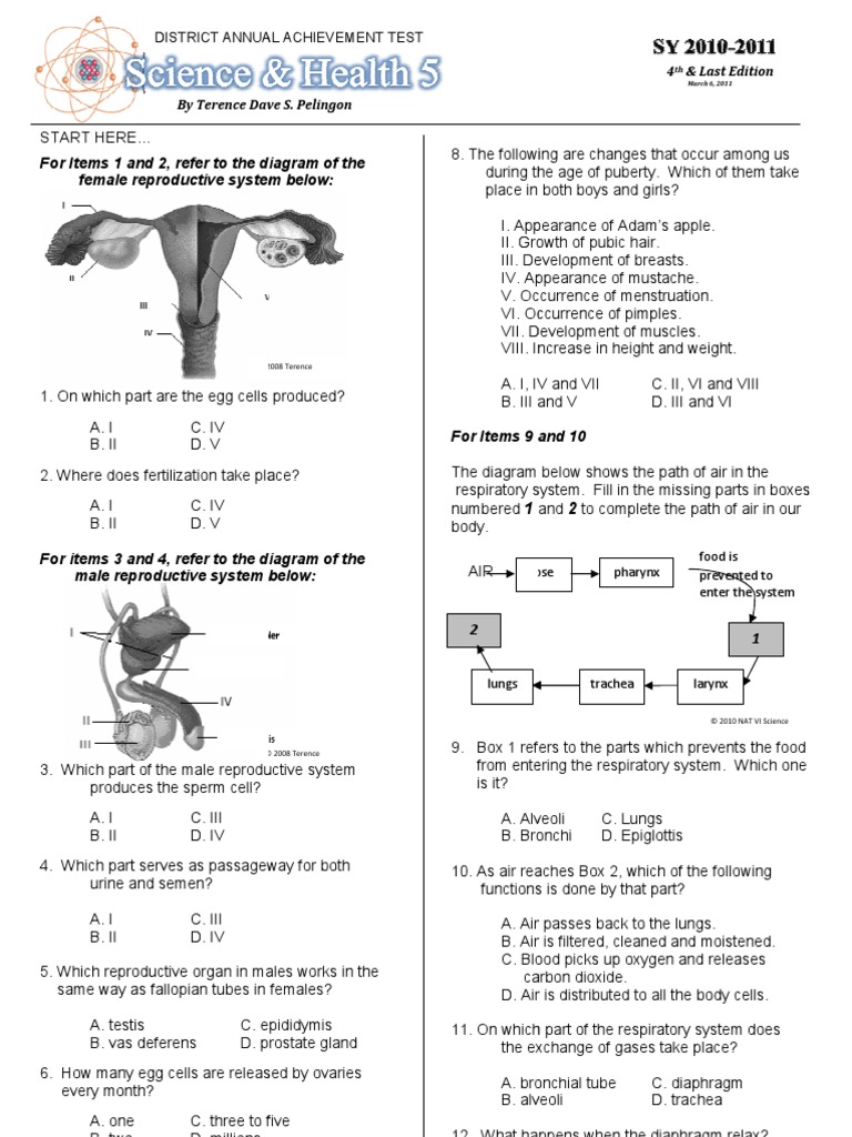 START HERE For Items 1 and 2, refer to the diagram of the female reproductive system below: 8. The following are changes that occur among us during the age of puberty. Which of them take place in both boys and girls? I. Appearance of Adams apple apple. II. Growth of pubic hair hair. III. Development of breasts breasts. IV. Appearance of mustache. V. Occurrence of menstruation menstruation. VI. Occurrence of pimples. VII. Development of muscles. VIII. Increase in height and weight.