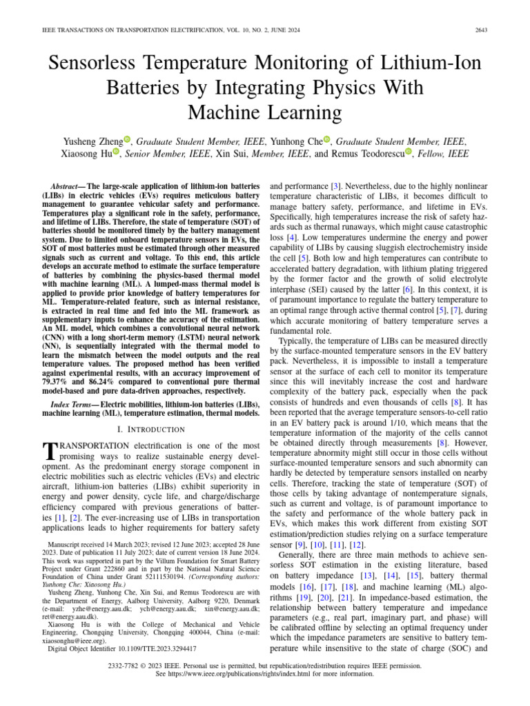 ZHENG et al.: SENSORLESS TEMPERATURE MONITORING OF LIBs BY INTEGRATING PHYSICS WITH ML 2651