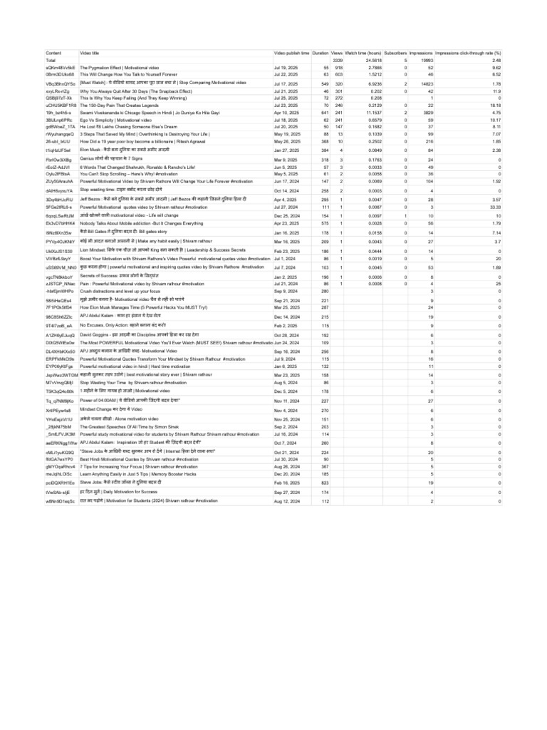 Content Video title Video publish time Duration Views Watch time (hours) Subscribers Impressions Impressions click-through
