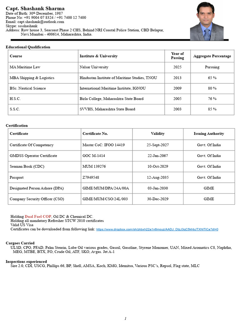 Seaman Book (CDC) MUM 139276 10-Oct-2029 Govt. Of India