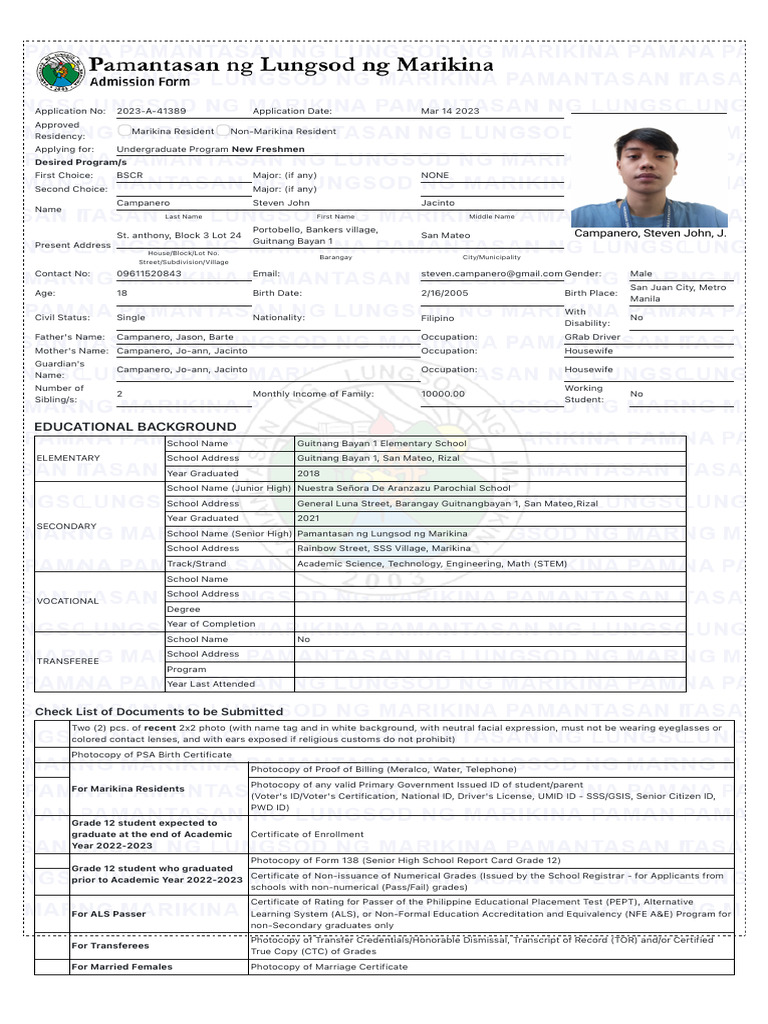 Father's Name: Campanero, Jason, Barte Occupation: GRab Driver