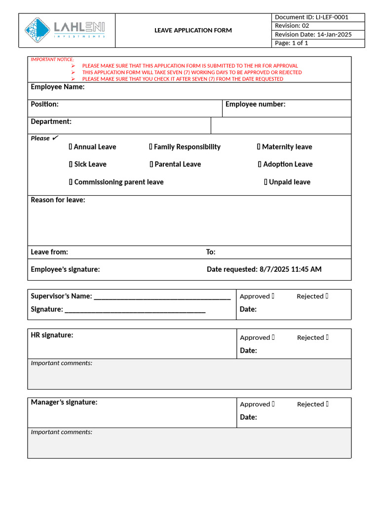 Employee’s signature: Date requested: 8/7/2025 11:45 AM