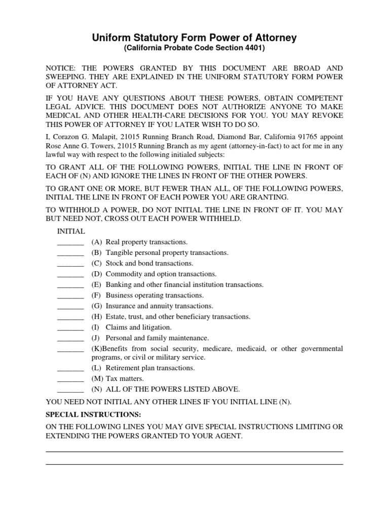 (California Probate Code Section 4401) NOTICE: THE POWERS GRANTED BY THIS DOCUMENT ARE BROAD AND SWEEPING. THEY ARE EXPLAINED IN THE UNIFORM STATUTORY FORM POWER OF ATTORNEY ACT. IF YOU HAVE ANY QUESTIONS ABOUT THESE POWERS, OBTAIN COMPETENT LEGAL ADVICE. THIS DOCUMENT DOES NOT AUTHORIZE ANYONE TO MAKE MEDICAL AND OTHER HEALTH-CARE DECISIONS FOR YOU. YOU MAY REVOKE THIS POWER OF ATTORNEY IF YOU LATER WISH TO DO SO. I, Corazon G. Malapit, 21015 Running Branch Road, Diamond Bar, California 91765 appoint Rose Anne G. Towers, 21015 Running Branch as my agent (attorney-in-fact) to act for me in any lawful way with respect to the following initialed subjects: TO GRANT ALL OF THE FOLLOWING POWERS, INITIAL THE LINE IN FRONT OF EACH OF (N) AND IGNORE THE LINES IN FRONT OF THE OTHER POWERS. TO GRANT ONE OR MORE, BUT FEWER THAN ALL, OF THE FOLLOWING POWERS, INITIAL THE LINE IN FRONT OF EACH POWER YOU ARE GRANTING. TO WITHHOLD A POWER, DO NOT INITIAL THE LINE IN FRONT OF IT. YOU MAY BUT NEED NOT, CROSS OUT EACH POWER WITHHELD. INITIAL _______ _______ _______ _______ _______ _______ _______ _______ _______ _______ _______ (A) Real property transactions. (B) Tangible personal property transactions. (C) Stock and bond transactions. (D) Commodity and option transactions. (E) Banking and other financial institution transactions. (F) Business operating transactions. (G) Insurance and annuity transactions. (H) Estate, trust, and other beneficiary transactions. (I) Claims and litigation. (J) Personal and family maintenance. (K)Benefits from social security, medicare, medicaid, or other governmental programs, or civil or military service. _______ (L) Retirement plan transactions. _______ (M) Tax matters. _______ (N) ALL OF THE POWERS LISTED ABOVE. YOU NEED NOT INITIAL ANY OTHER LINES IF YOU INITIAL LINE (N). SPECIAL INSTRUCTIONS: ON THE FOLLOWING LINES YOU MAY GIVE SPECIAL INSTRUCTIONS LIMITING OR EXTENDING THE POWERS GRANTED TO YOUR AGENT.