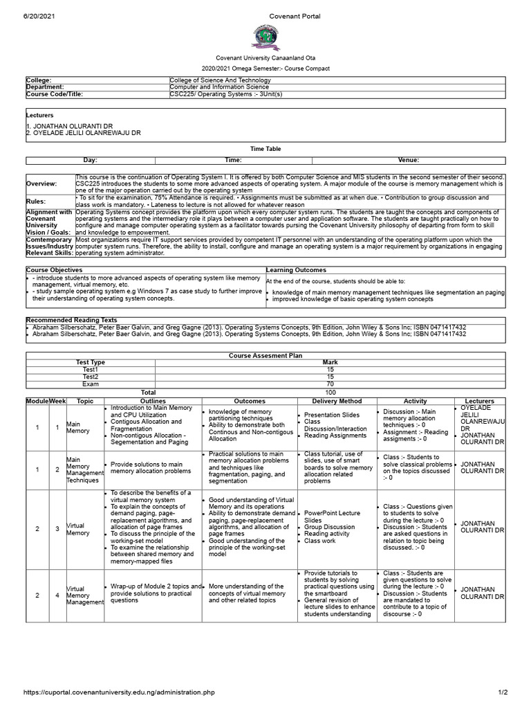 Course Code/Title: CSC225/ Operating Systems :- 3Unit(s)