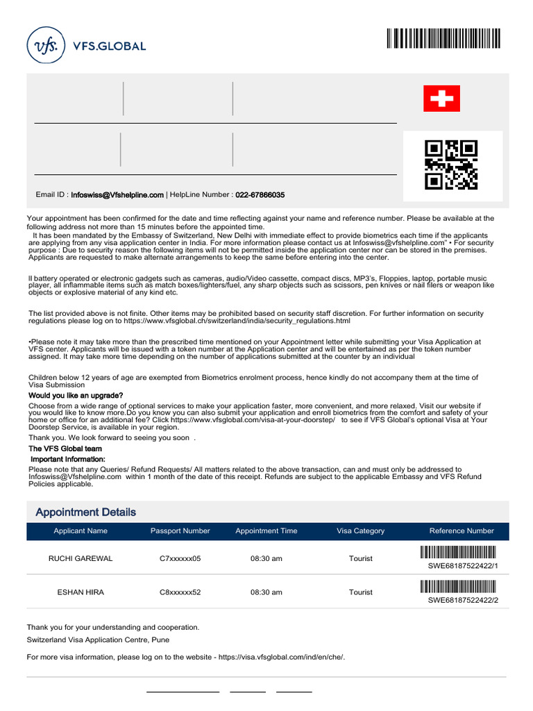 are applying from any visa application center in India. For more information please contact us at Infoswiss@vfshelpline.com” • For security